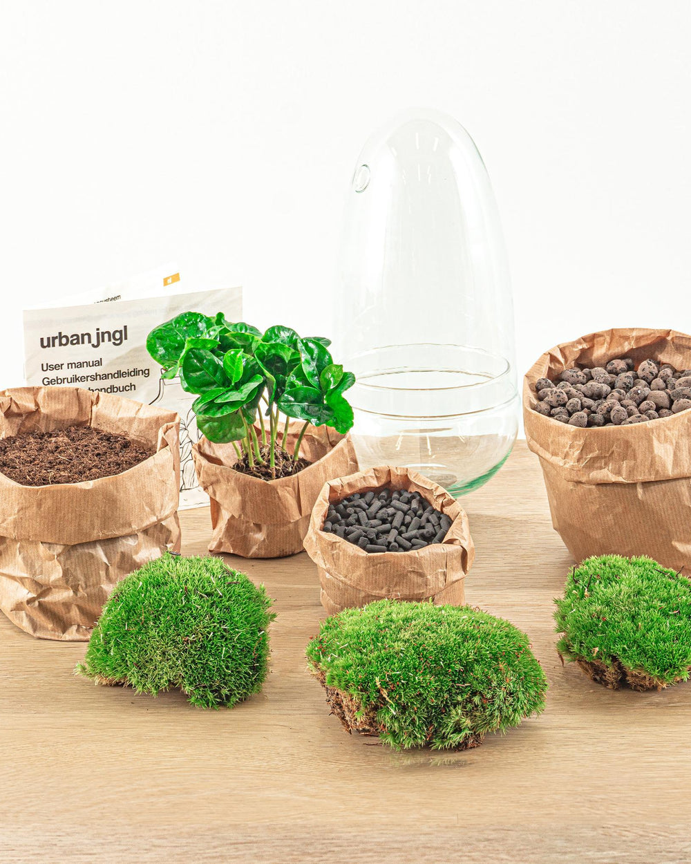 Cada kit é composto por tudo o que é necessário para fazer um terrário: um jardim em miniatura quase autônomo e autossuficiente. Ideal quando você não tem um polegar verde!
